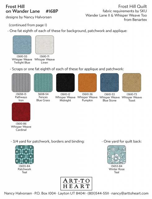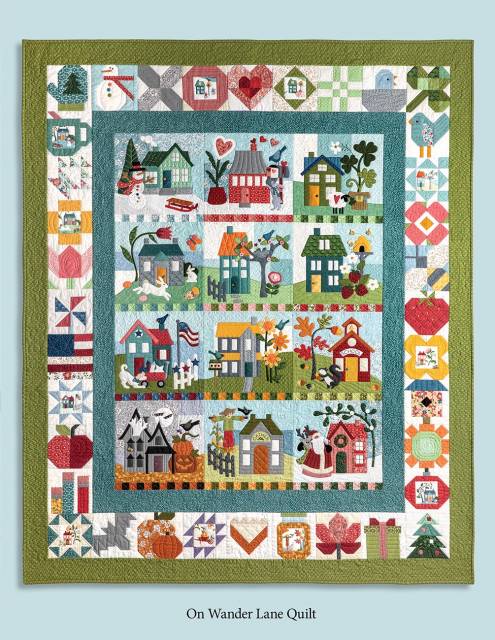 This 8-1/2" x 11" pattern offers a stand alone block of the month quilt that measures 30" square, plus six additional projects including an additional appliqué project, a table topper, pot holder, pillows, mini quilts and mug rug! The appliqué block for each month and one each of three pieced blocks make up the On Wander Lane quilt measuring 60" x 72". There's lots of fun happening On Wander Lane!